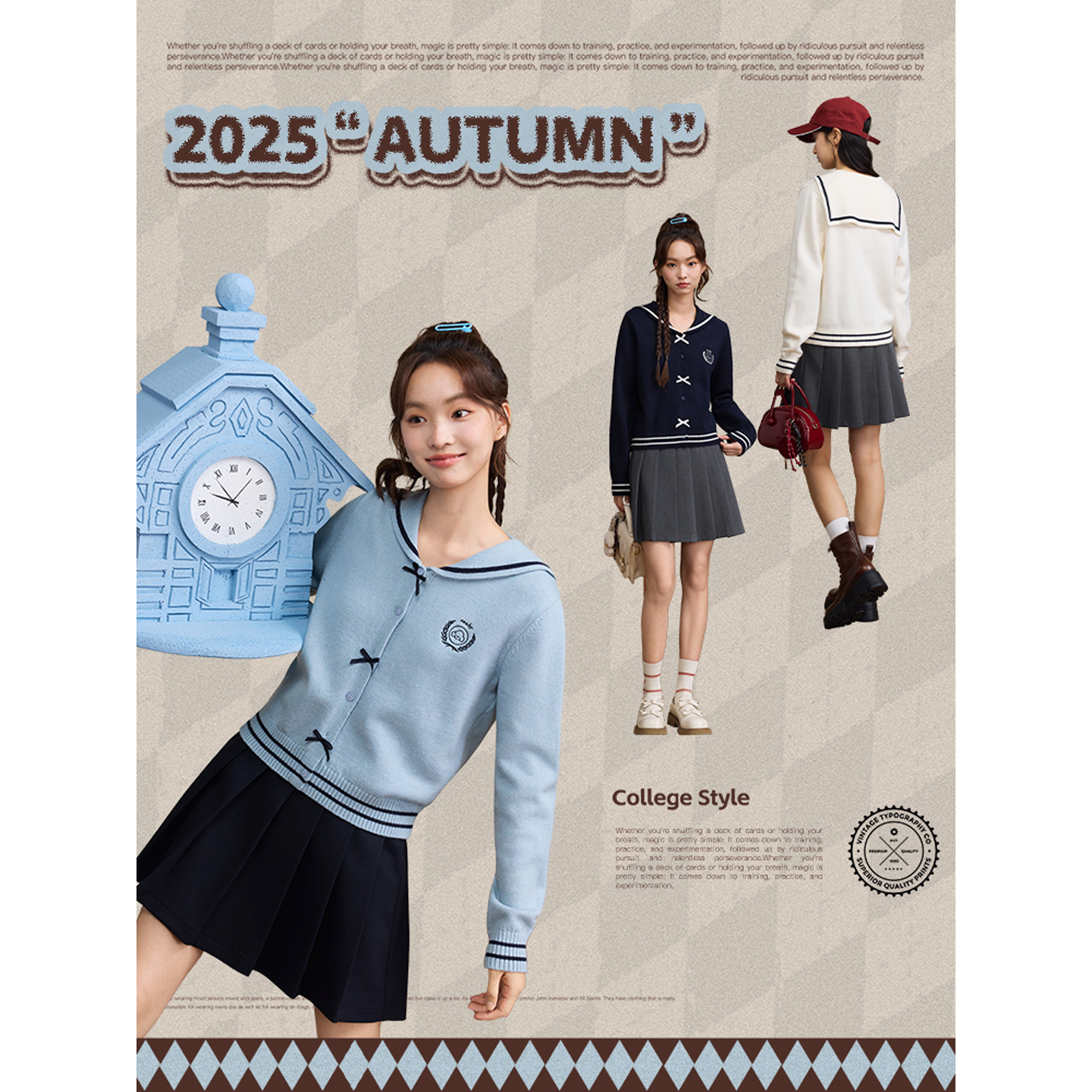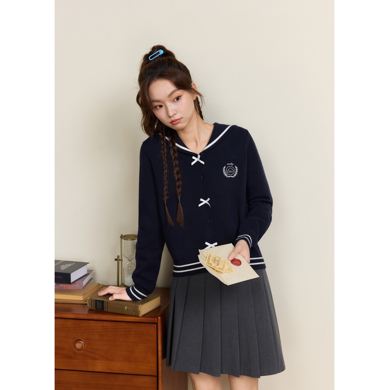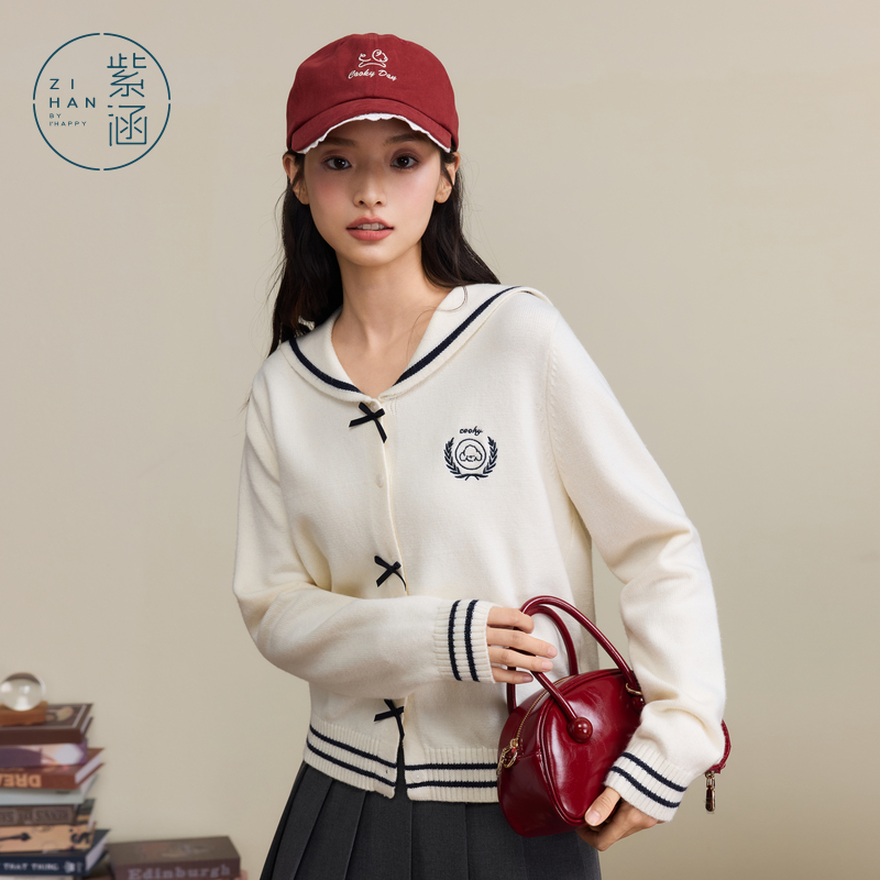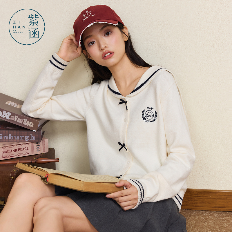 甜美学院风宽松显瘦针织衫 新款 外套 女2025秋季 紫涵海军领毛衣开衫