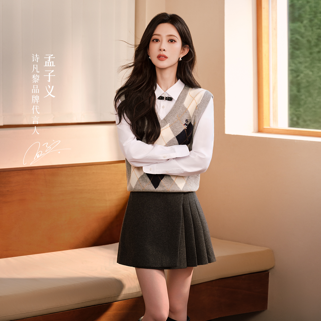 新款 女秋季 叠穿日系复古V领马甲背心 衬衫 白色抽绳设计感宽松长袖