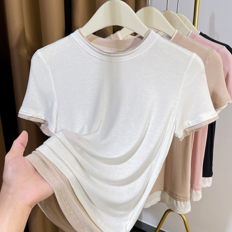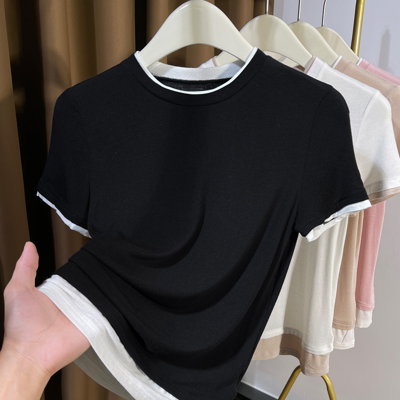 撞色莫代尔假俩件t恤女短袖 冰丝皮肤衣女超薄小圆领上衣 2025新款