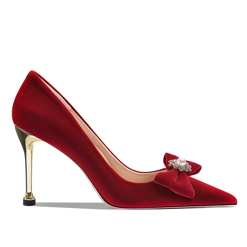 结婚鞋 中式 子新娘敬酒鞋 蝴蝶结绒面高跟鞋 秀禾鞋 女酒红色单鞋 婚鞋