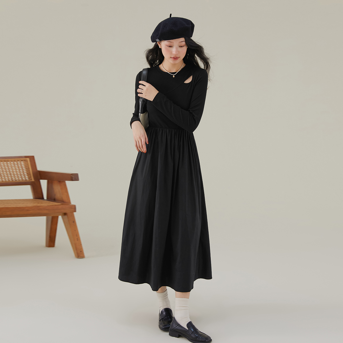 a02黑猫系列黑色假两件连衣裙女2025新款 宽松设计感卫衣裙子 秋季