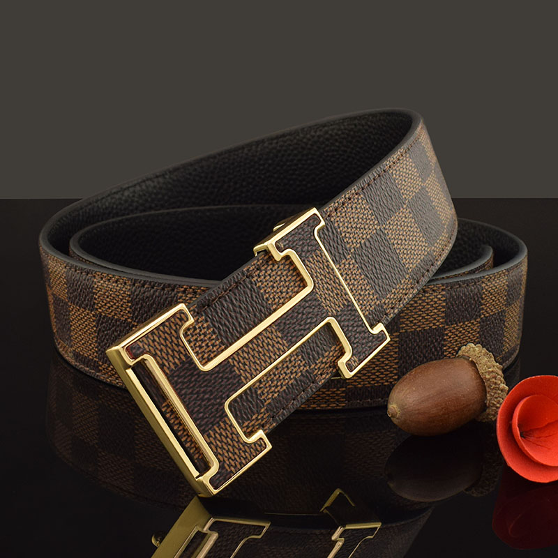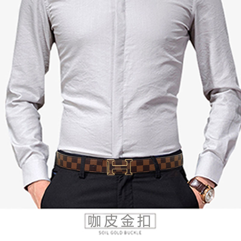 潮流格纹牛皮裤 真皮平滑扣休闲百搭流行腰带男韩版 带 皮带男士 时尚