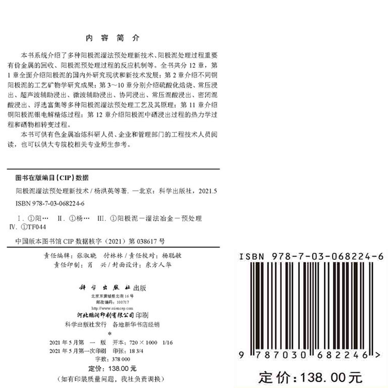 杨洪英等科学出版 阳极泥湿法预处理新技术 社9787030682246 全新现货精装 正版