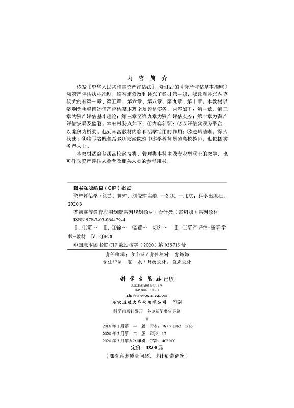黄辉 徐茜 刘俊萍 第二版 资产评估学