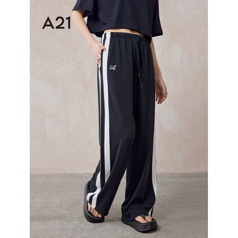 条纹撞色设计感简约直筒裤 A21女装 运动美式 夏季 拖地垂感黑色长裤