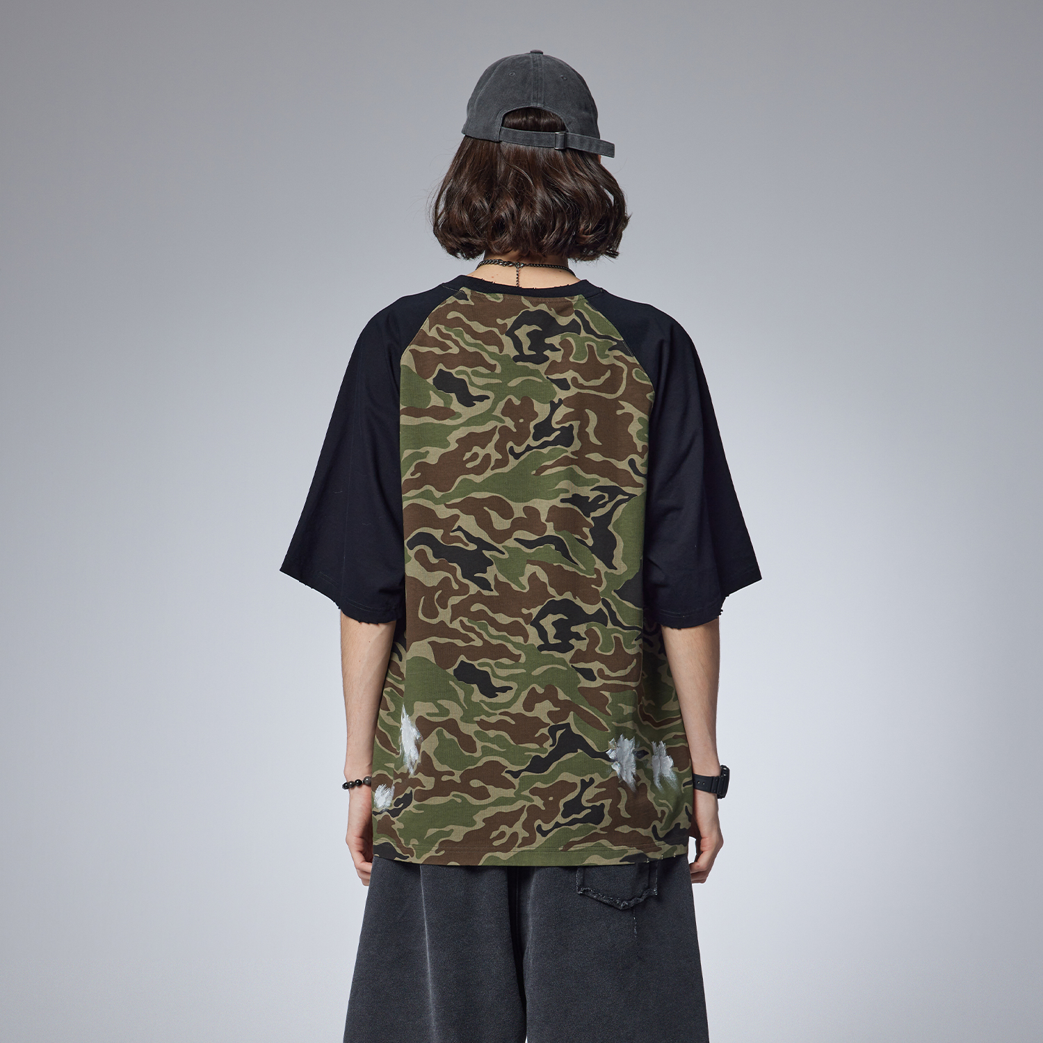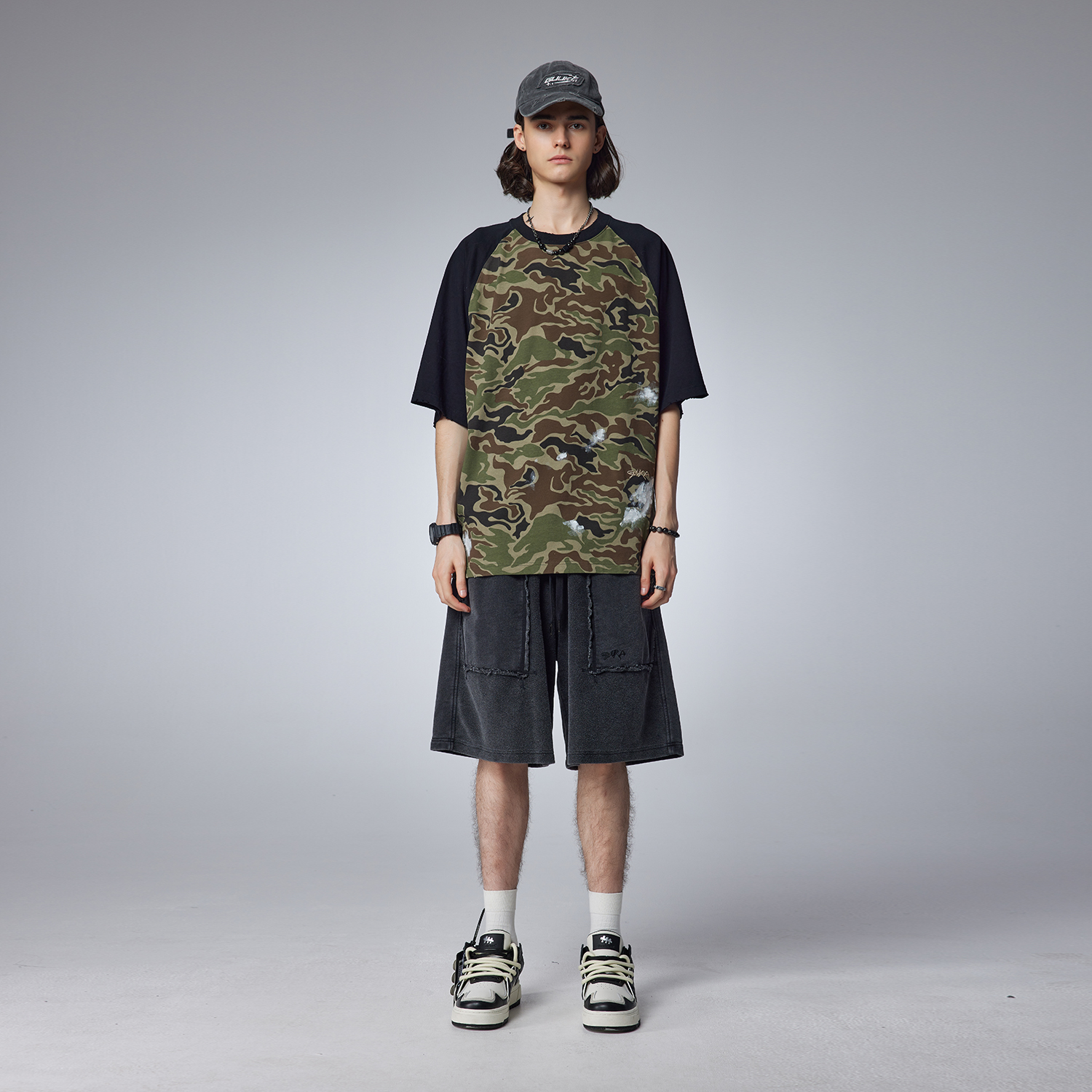 重磅T恤潮青少年手工刷色插肩袖 新款 上衣宽松 男夏季 GUUKA迷彩短袖