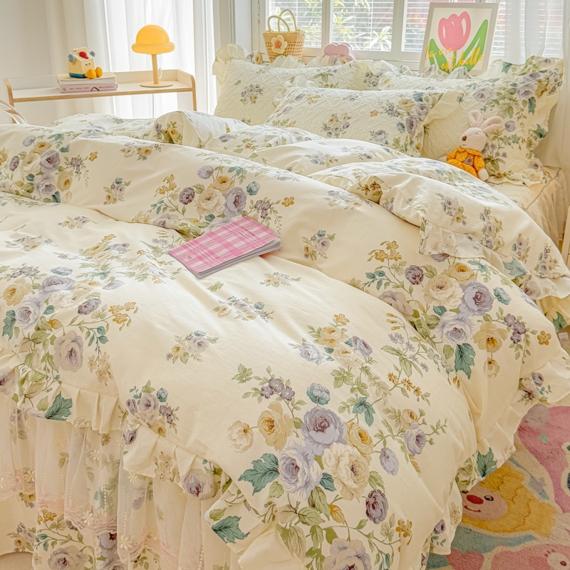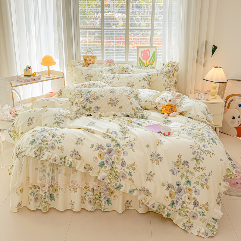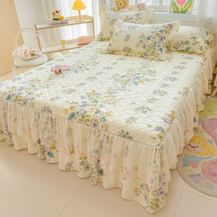 全棉夹棉床裙四件套100%纯棉床上被套公主风防滑床罩四季 花边被罩