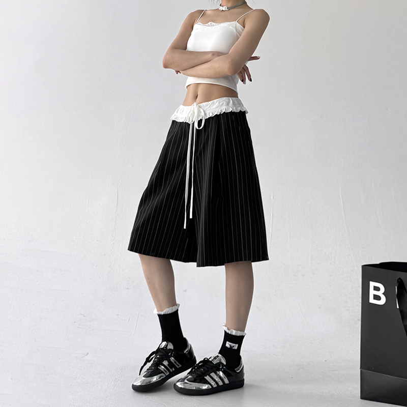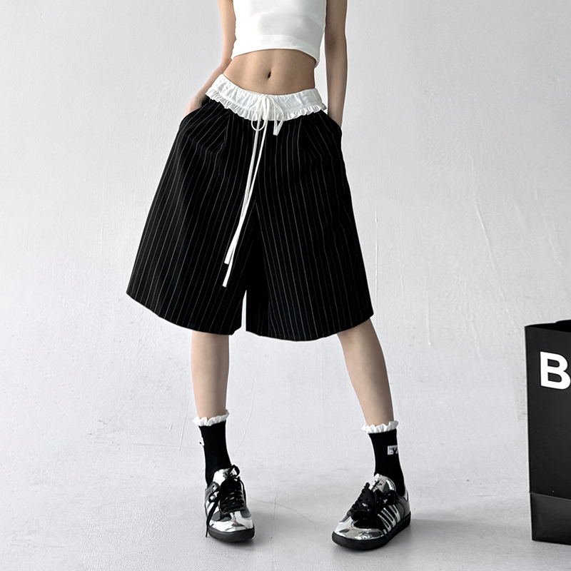 新款 女2025夏季 美式 低腰宽松卫裤 子 复古显瘦条纹西装 直筒五分裤 裤