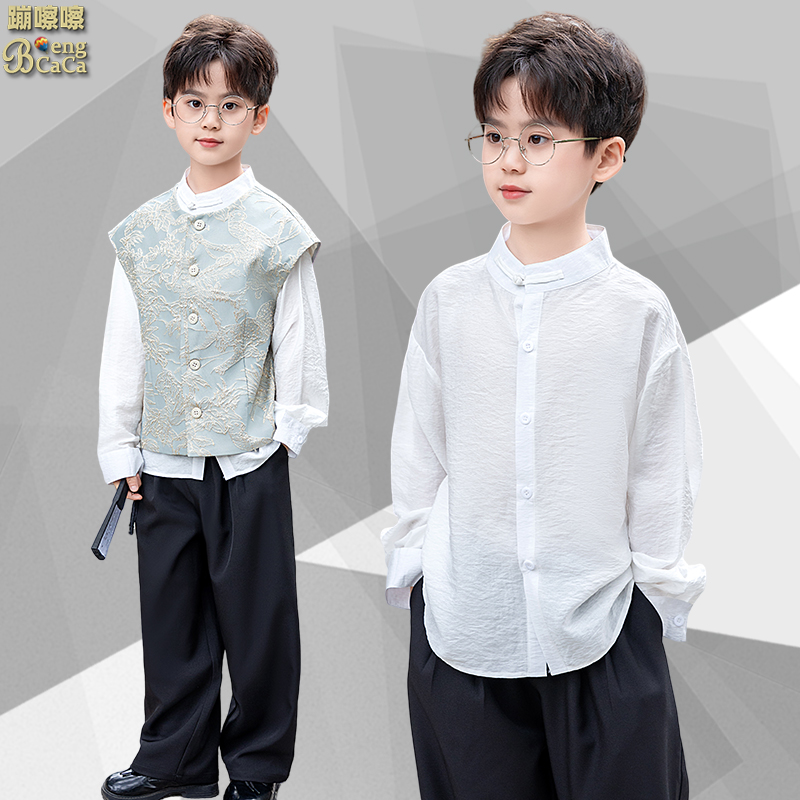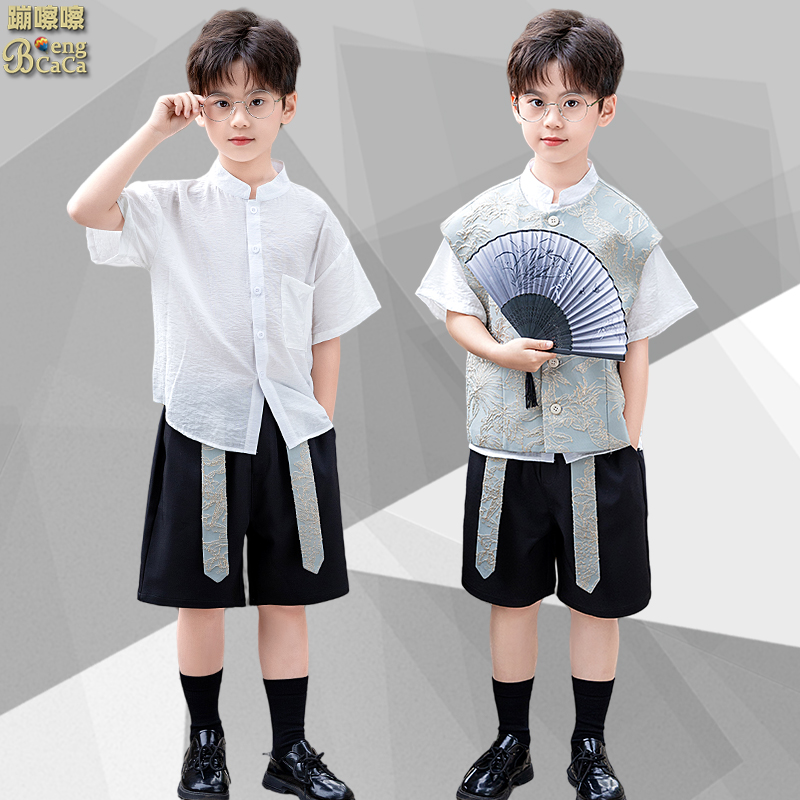 刺绣国潮套装 儿童走秀表演国风帅气演出服夏季 马甲唐装 男童新中式
