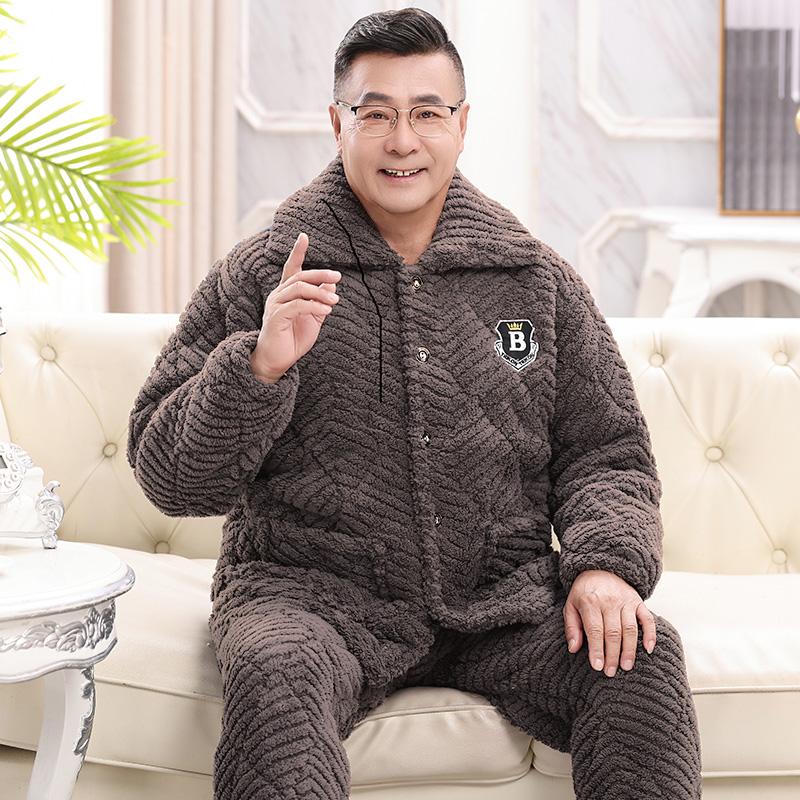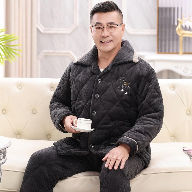 新款 三层加厚夹棉睡衣中老年珊瑚绒套装 冬天保暖棉袄 男士 爸爸冬季