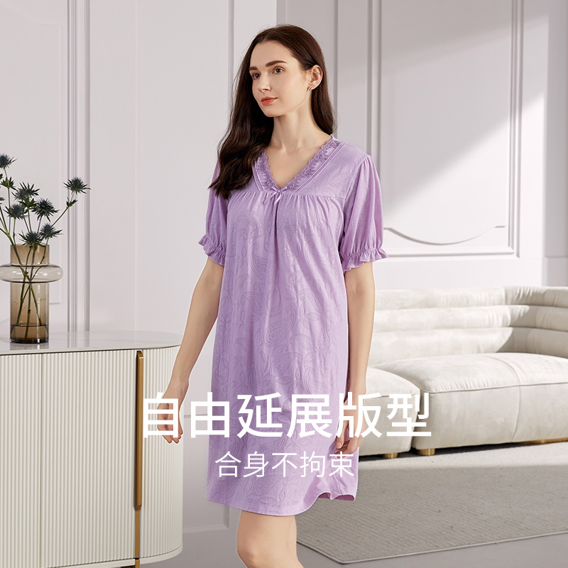 秋鹿睡裙女夏季 裙子睡衣 提花优雅V领气质家居服短袖