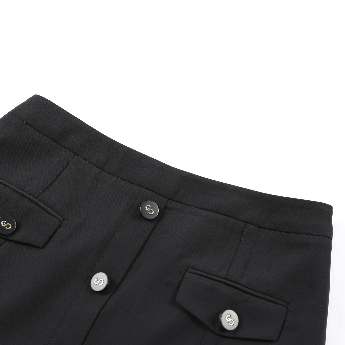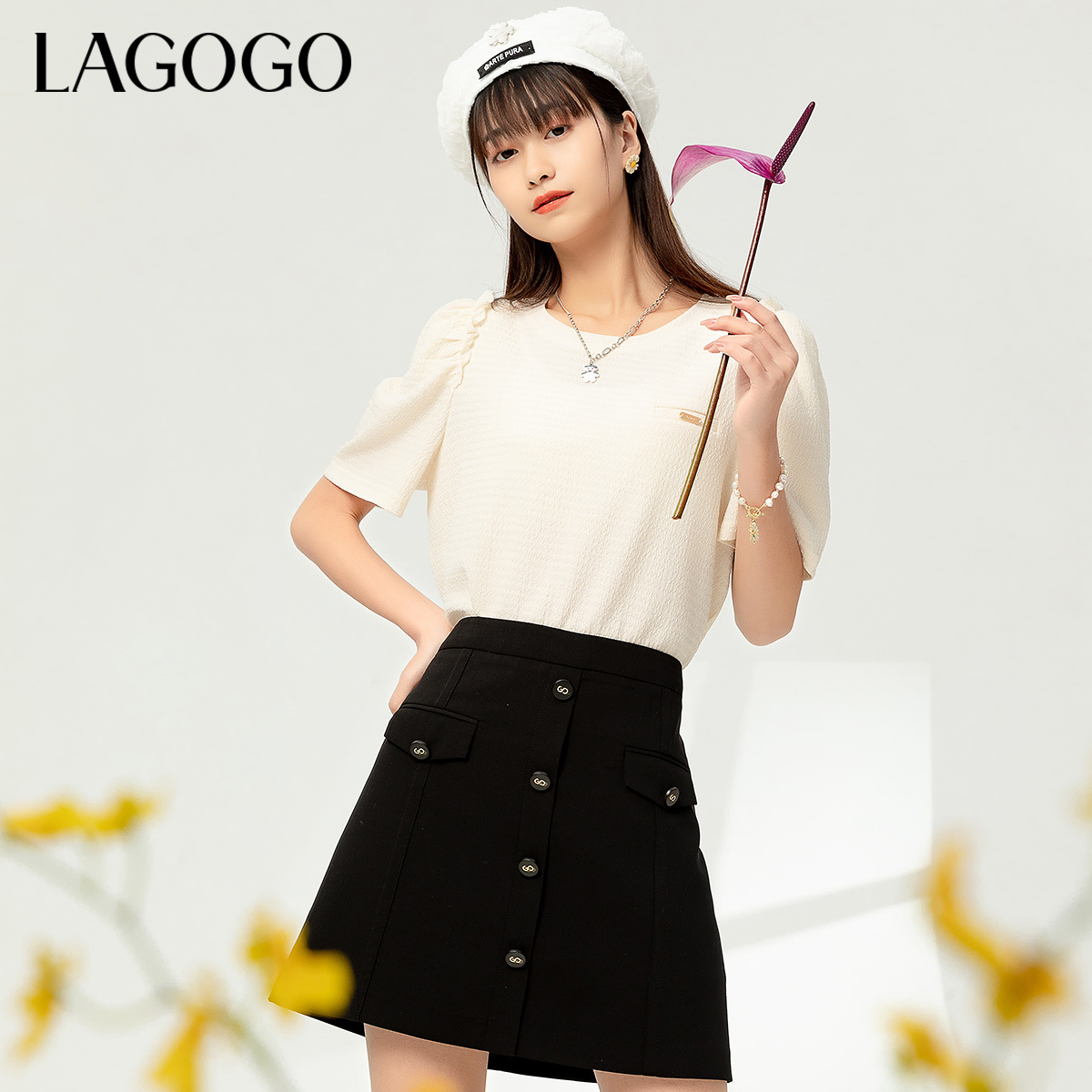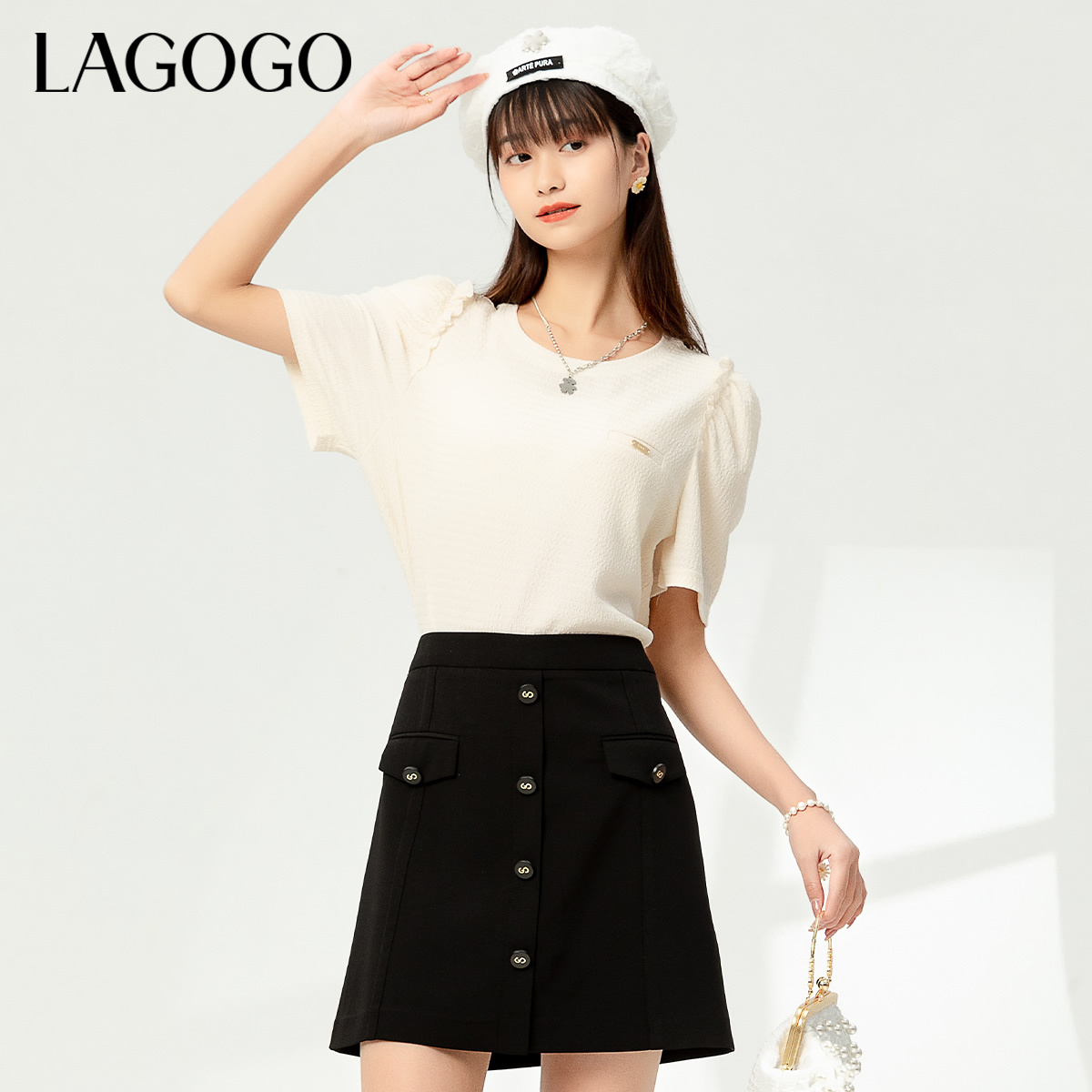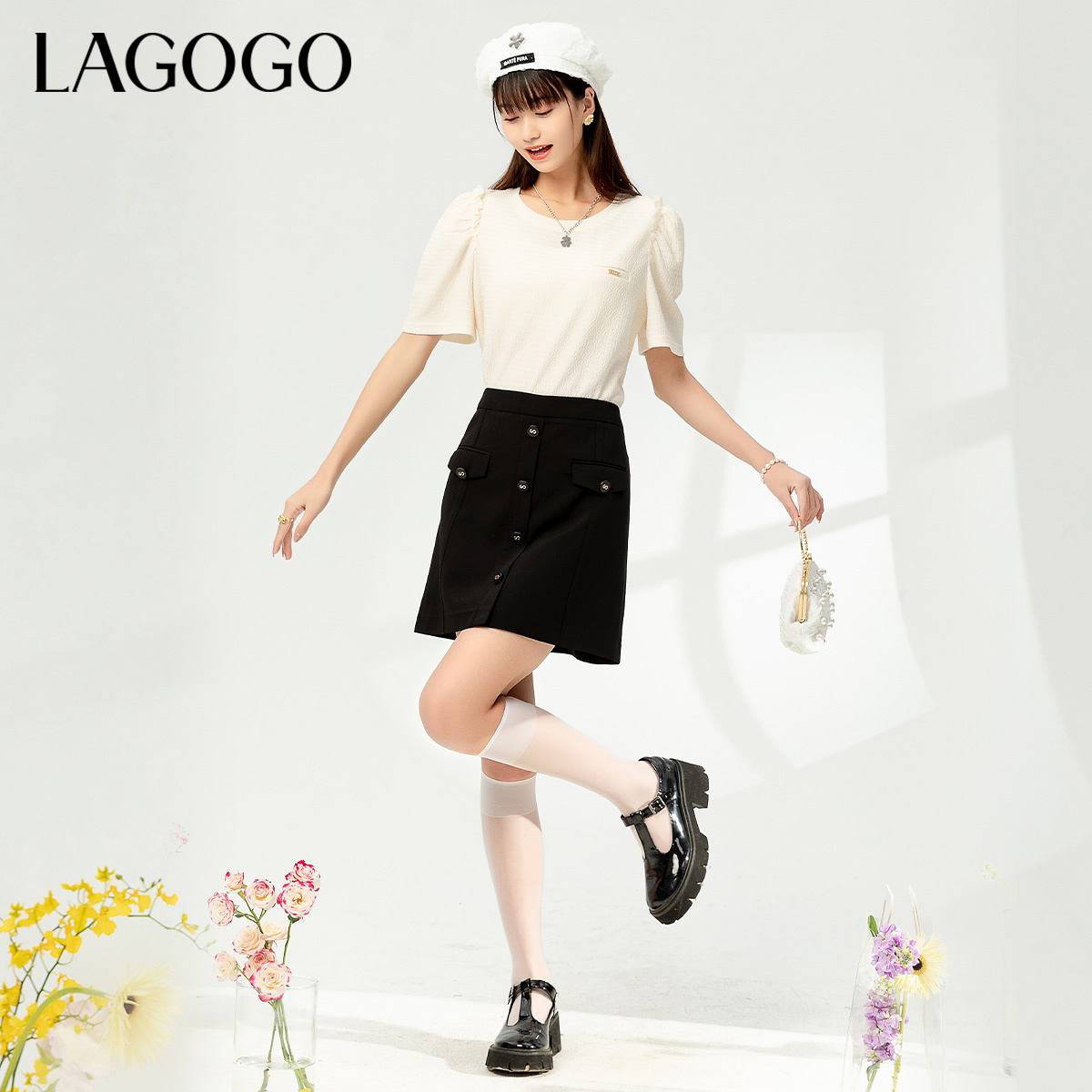 Lagogo拉谷谷精致纽扣高腰显瘦A字黑色半身裙女春季 百搭短裙 新款
