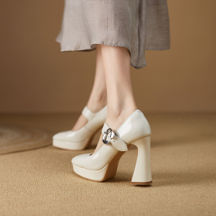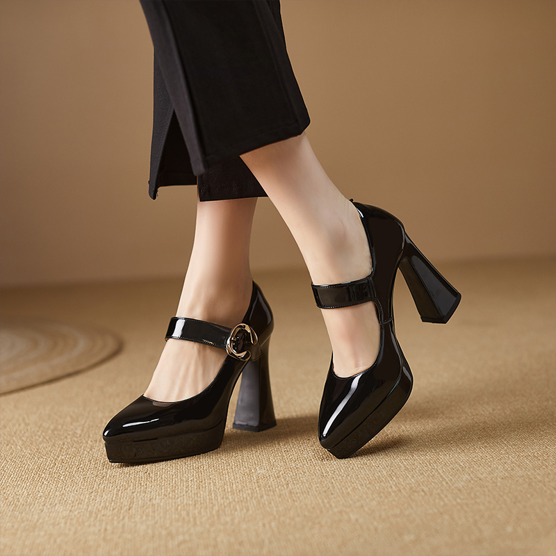 子防水台粗跟高跟鞋 漆皮单鞋 黑色真皮鞋 尖头2025年春秋新款 女法式