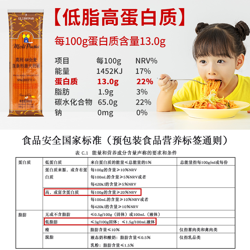 家用意面意粉通心粉 包邮 进口莫利全麦直身意大利面条500g 满5袋
