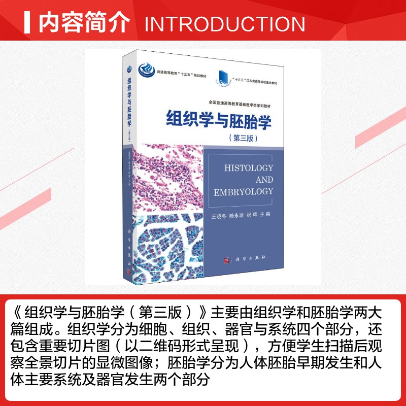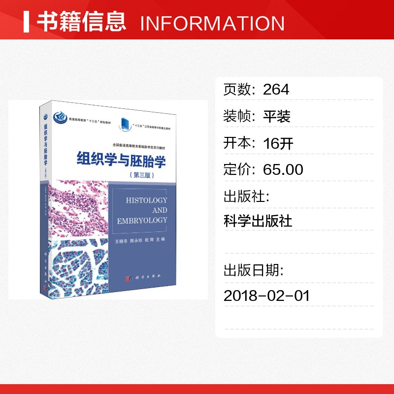 基础医学大中专 社 王晓冬 科学出版 图书籍 新华书店正版 编 祝辉 陈永珍 第3版 组织学与胚胎学