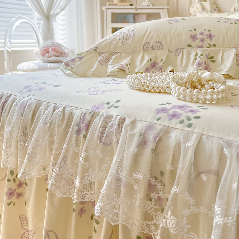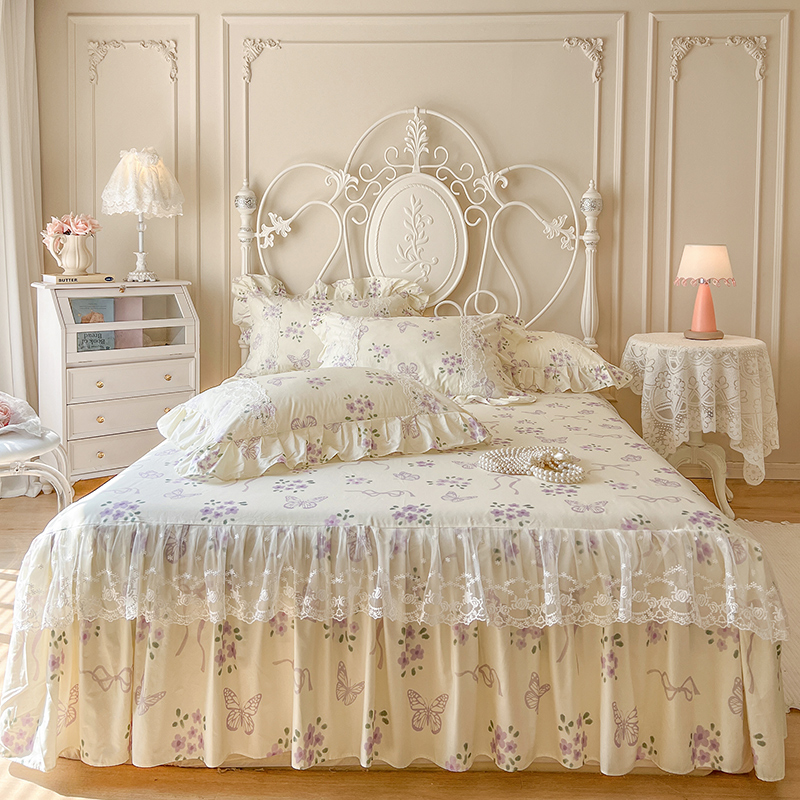 皇朝家私全棉印花床四件套公主风蕾丝花边床裙纯棉被套四季 通用