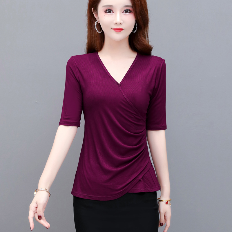 上衣2023春夏季 新款 高弹V领中袖 莫代尔大码 T恤衫 打底衫 长袖 五分袖