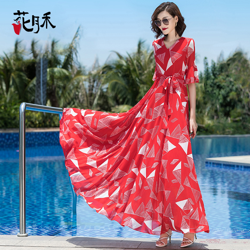 XZY 御姐包臀长裙 微胖轻熟风性感V领系带印花连衣裙女25年夏修身