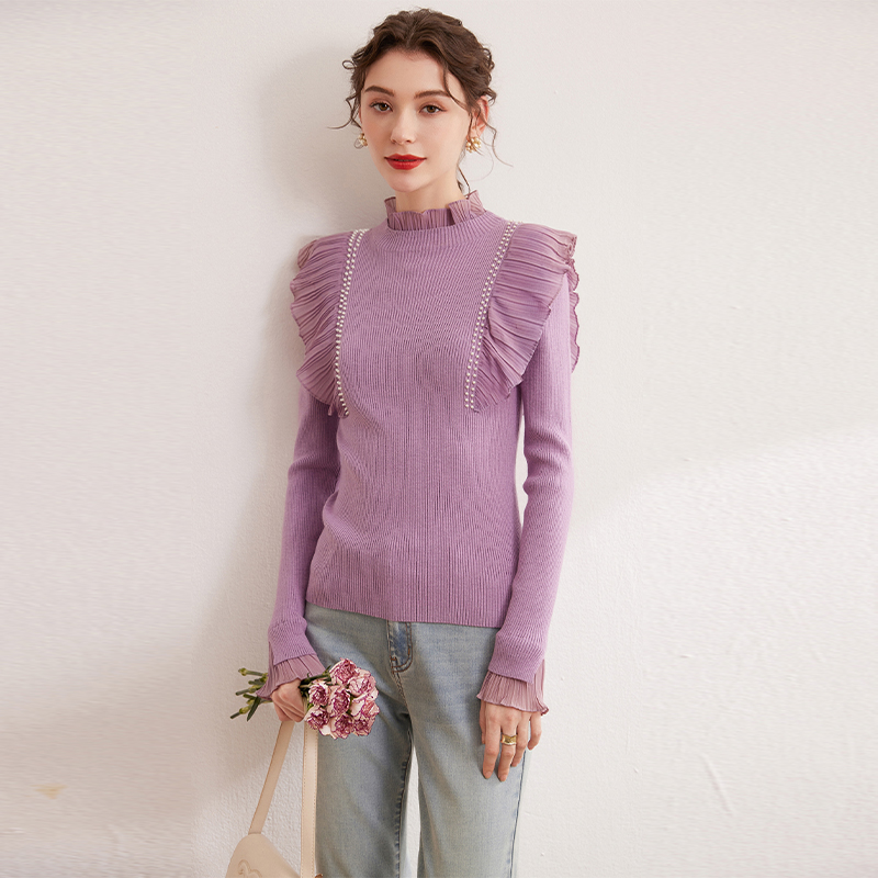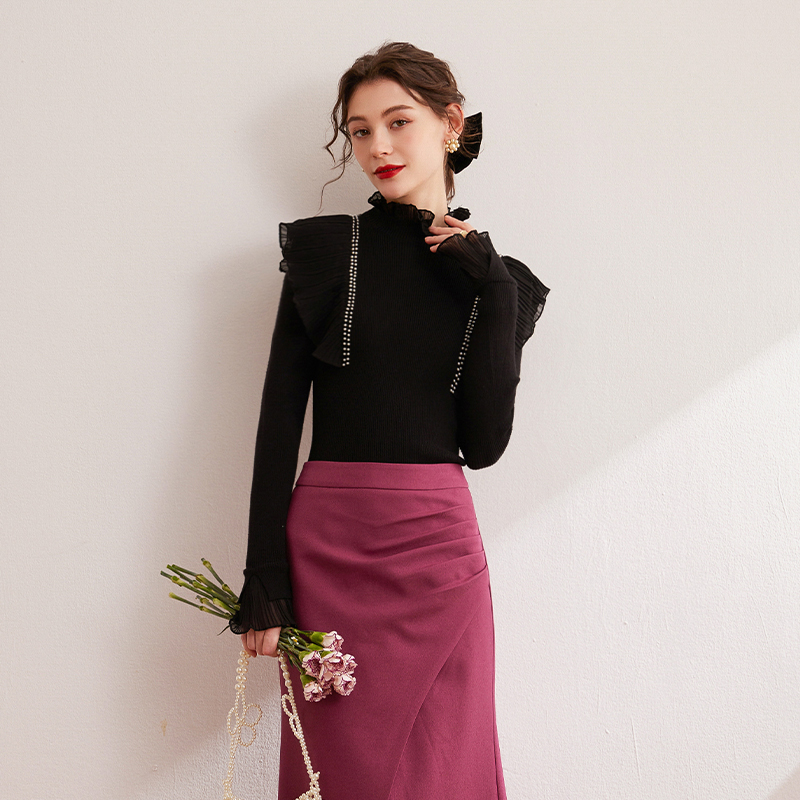 时尚 针织衫 优雅钉珠修身 女式 长袖 白鹿语高领拼接花边上衣秋冬款