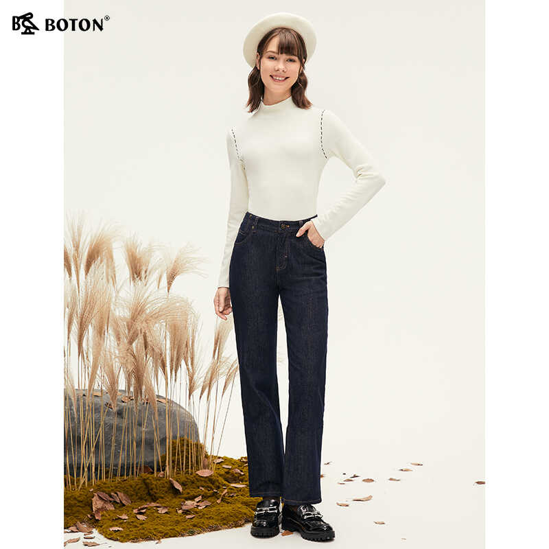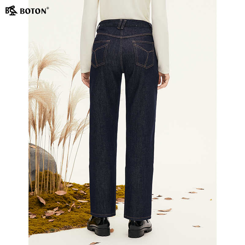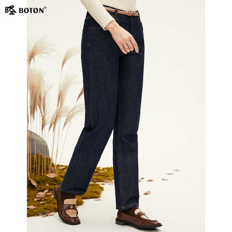 新款 波顿2025年春夏季 女士直筒宽松高端深蓝色弹力牛仔裤 防掉色