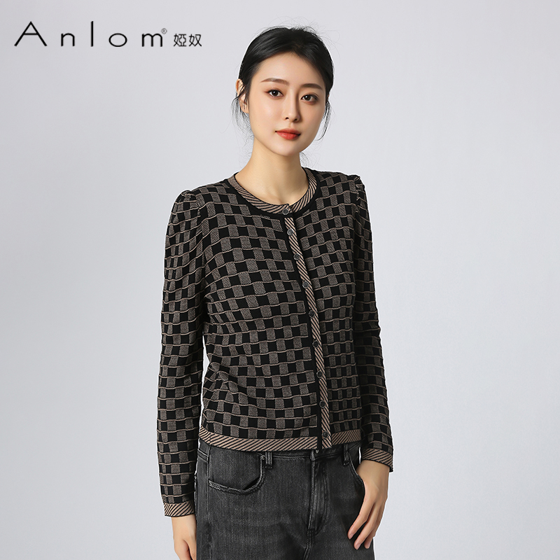 提花 秋冬针织开衫 Anlom 娅奴毛衣外套女棋盘格品牌新款