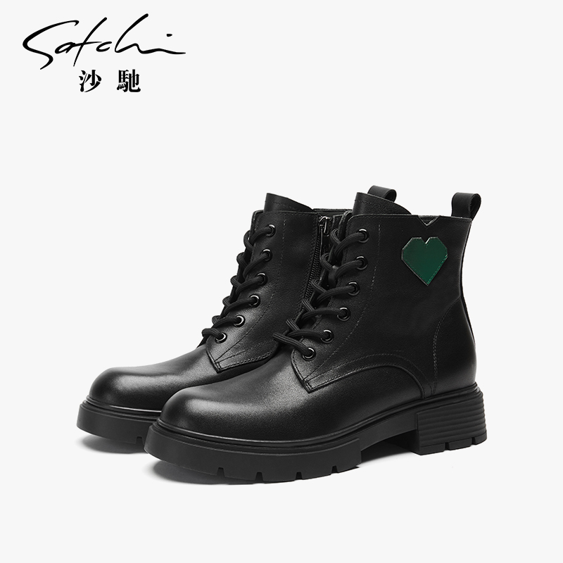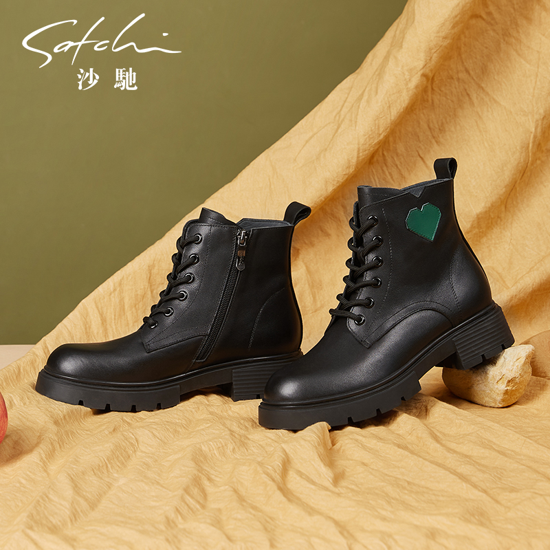 周雨彤推荐 百丽黑桃少女靴厚底马丁靴真皮加绒短靴子B8K1DDD4预