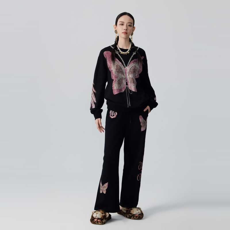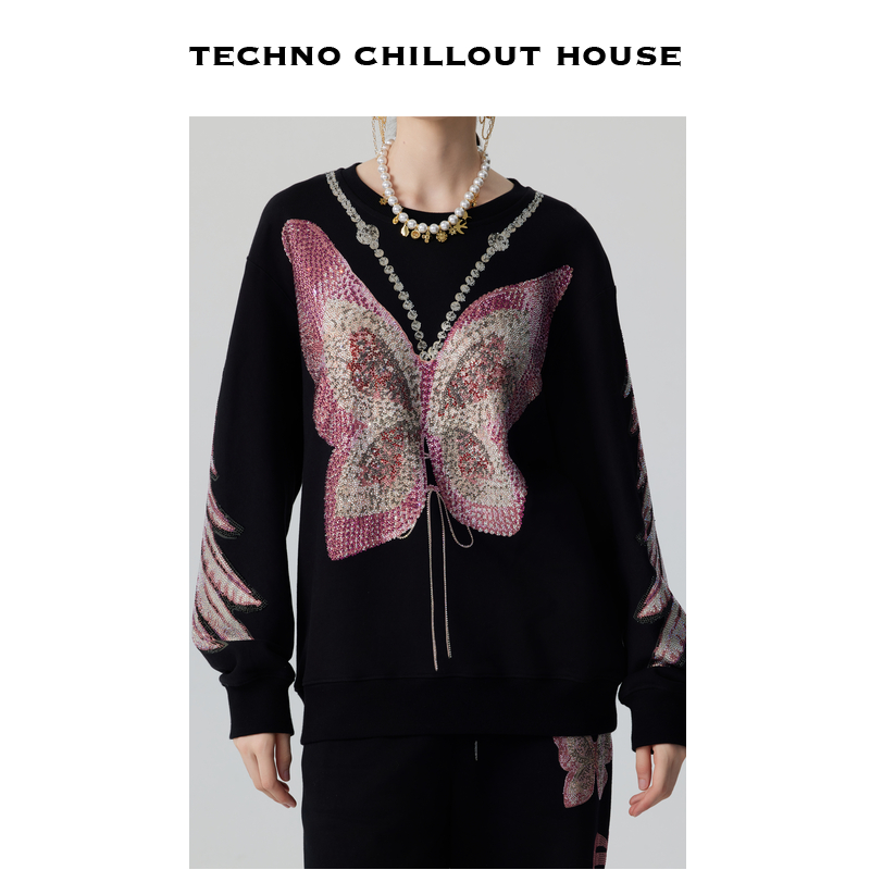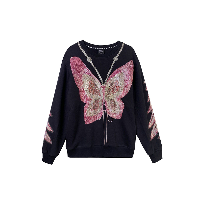 25春夏季 TCH蝴蝶烫钻圆领黑色个性 男女款 百搭宽松圆领衫 卫衣时尚
