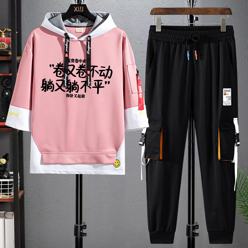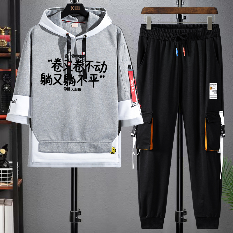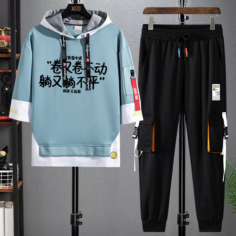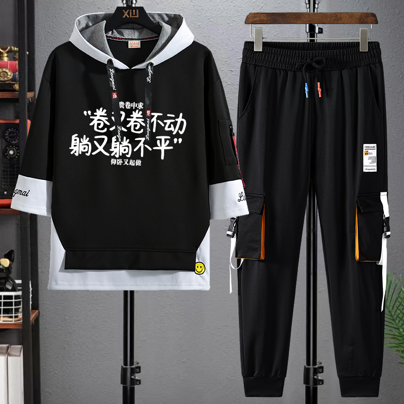 两件套男装 夏季 潮流宽松休闲宽松一套搭配痞帅长裤 T恤套装 短袖