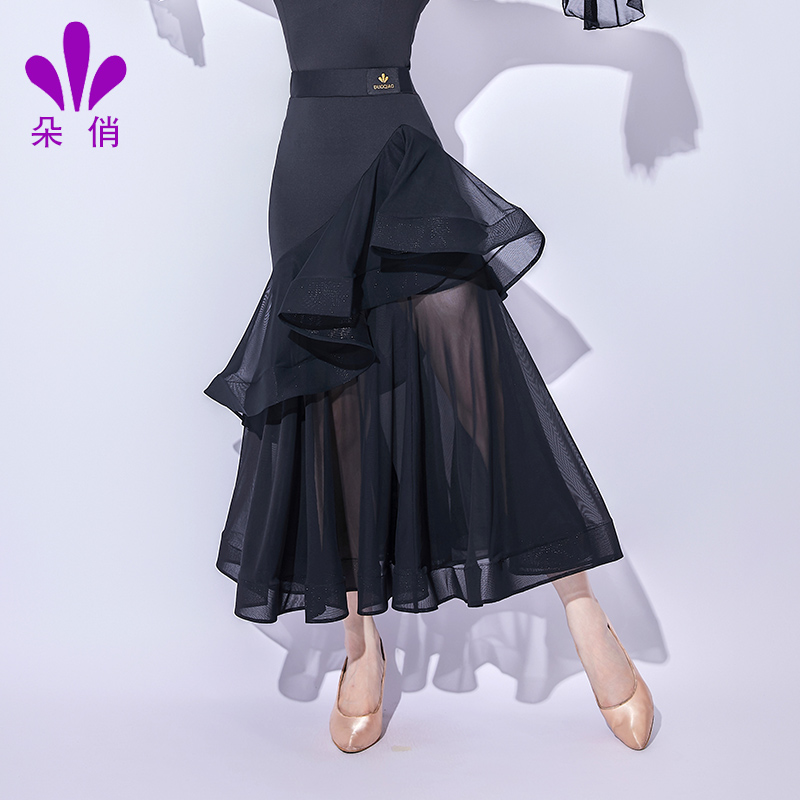 CONNY拉丁舞半身裙女跳舞蹈练功服下装 不规则国标摩登舞裙子黑色