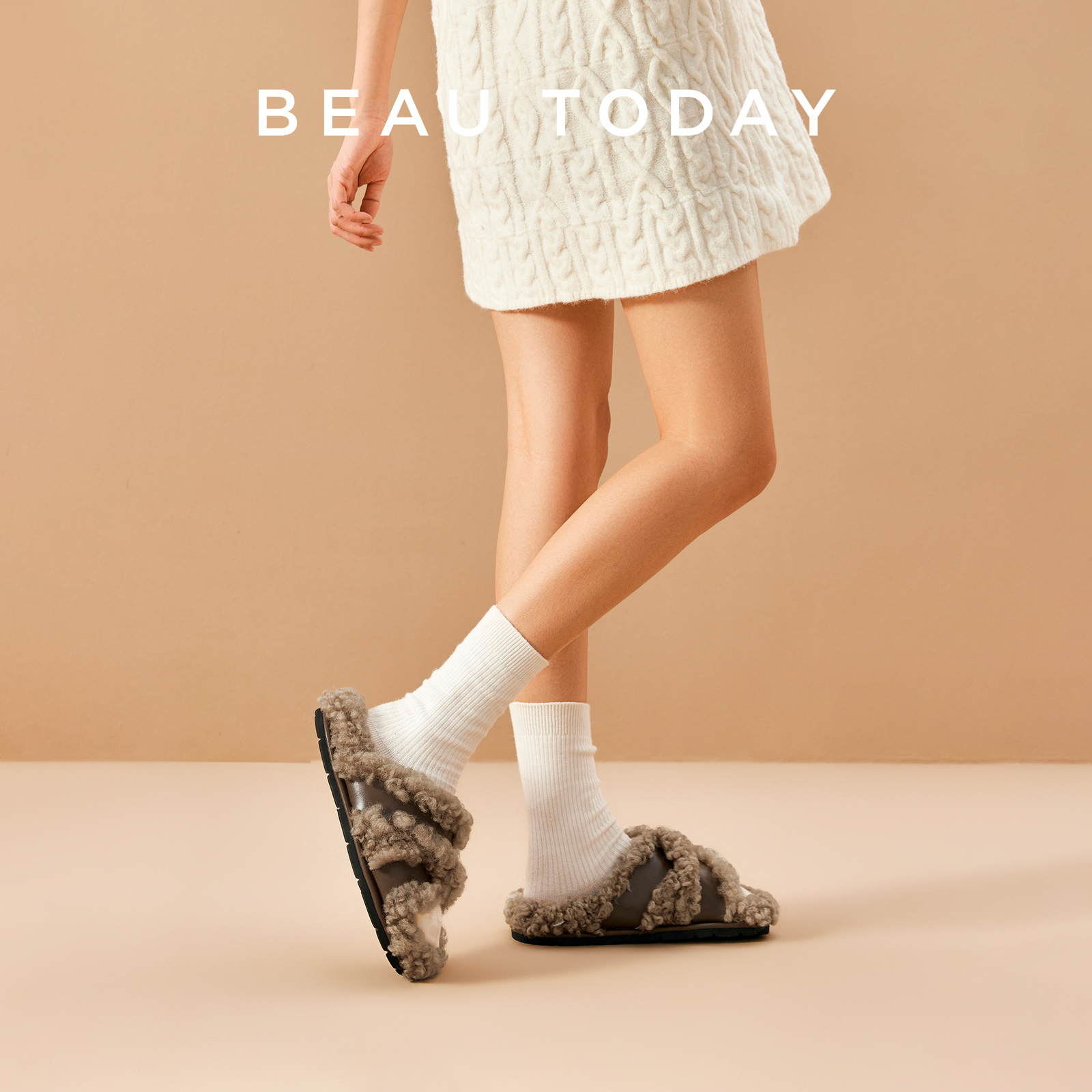 女外穿新款 真皮拖鞋 秋季 平底勃肯鞋 BT黑色拖鞋 BeauToday毛毛拖鞋