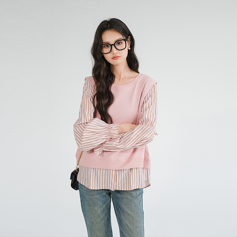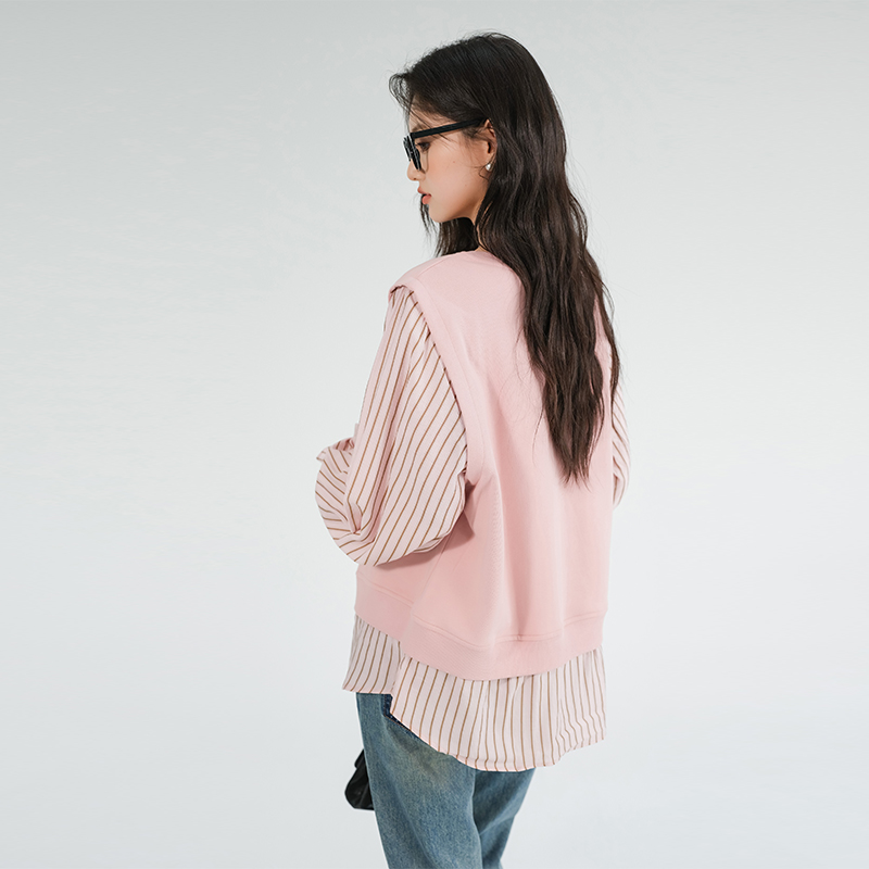 新款 拼接假两件条纹卫衣胖mm秋季 宽松减龄套头上衣 女装 蓝若水大码
