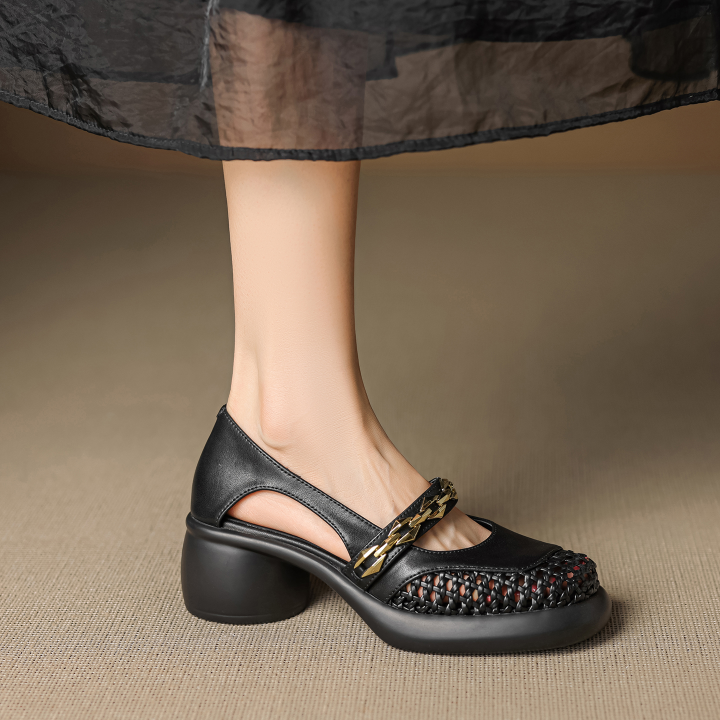 镂空2025夏季 编织方头粗跟凉鞋 新款 透气时尚 女鞋 开怀依足羊皮法式