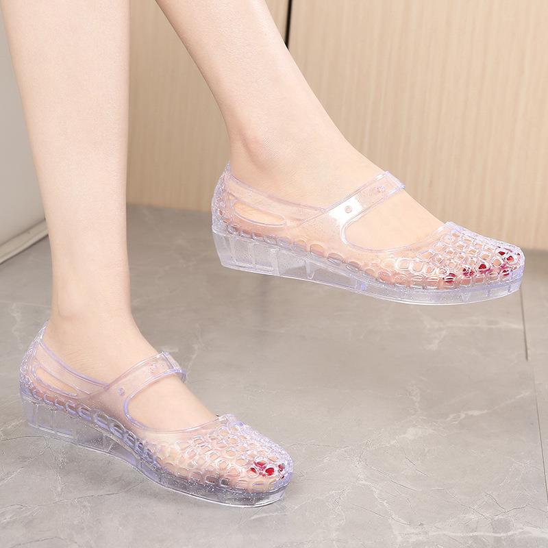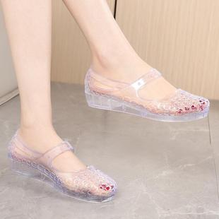 单鞋 新款 包头外穿镂空果冻透明坡跟网红ins潮时尚 女夏季 水晶凉鞋