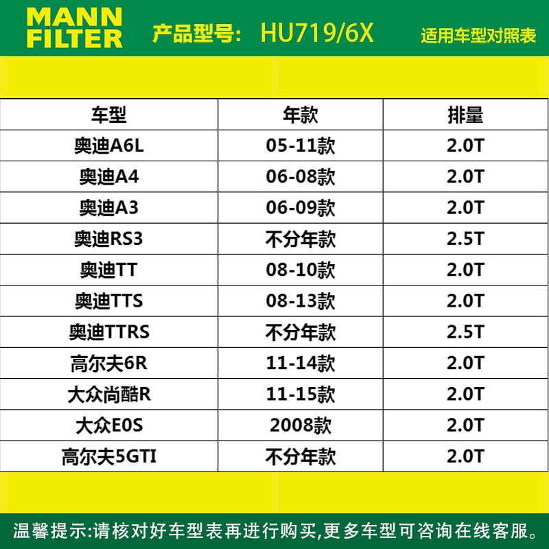 曼牌滤清器HU719 TT大众甲壳虫捷达尚酷R 6X机油滤芯适用奥迪A6