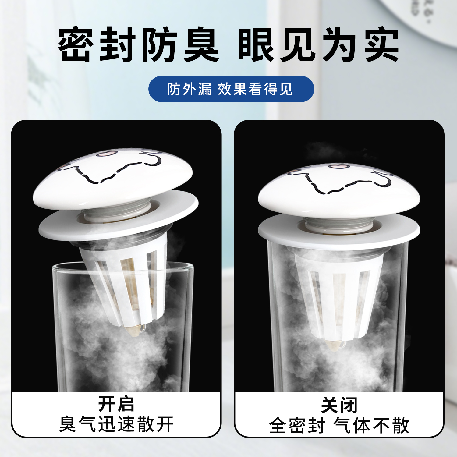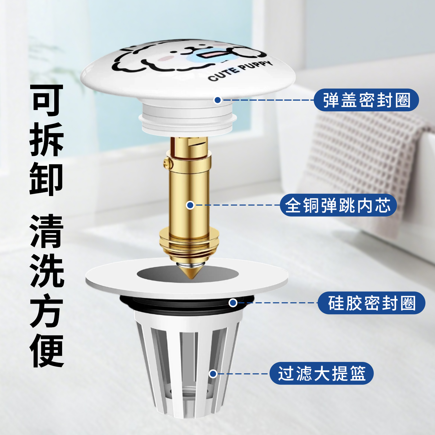 可爱小狗洗脸盆面盆陶瓷按压式 弹跳漏水塞封口盖下水管防返臭神器