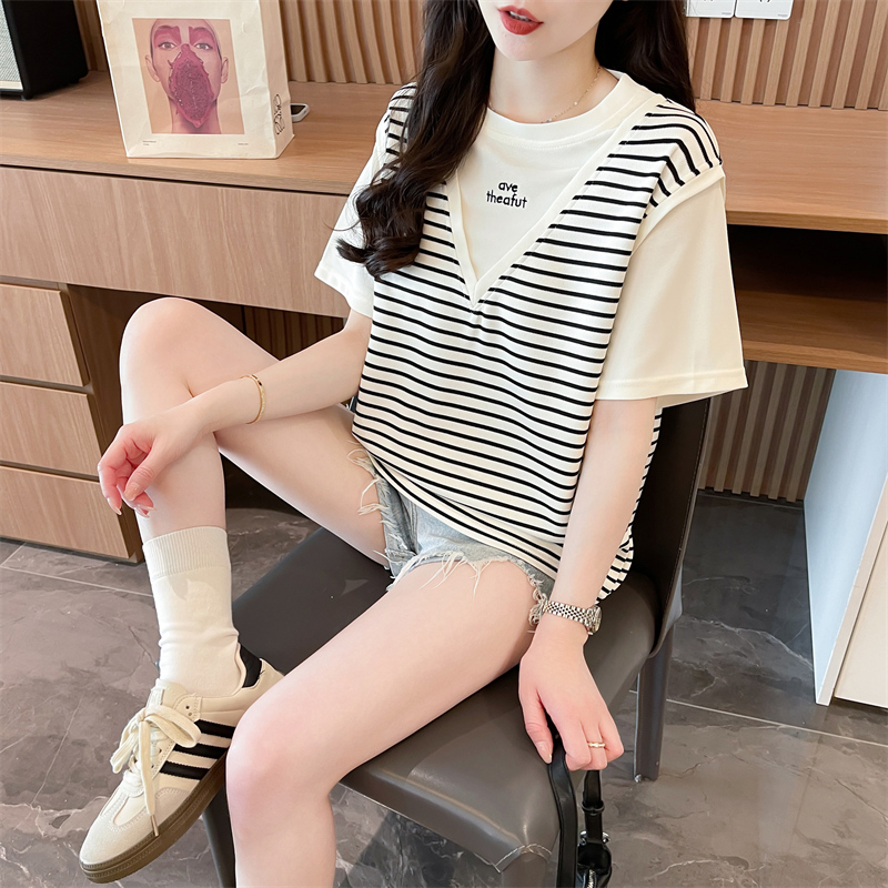 宽松大码 2025新款 小个子条纹刺绣上衣 t恤女夏季 假两件设计感短袖