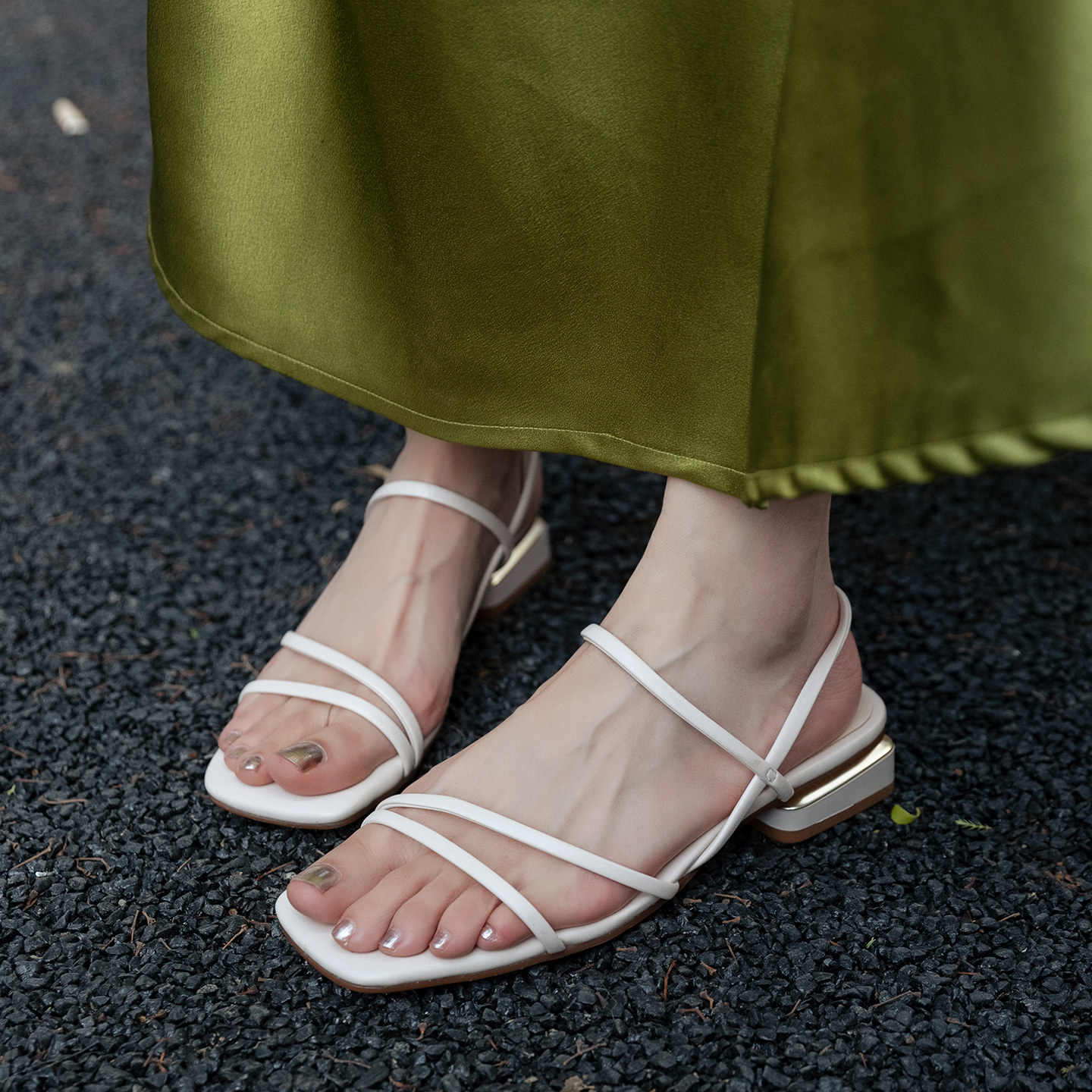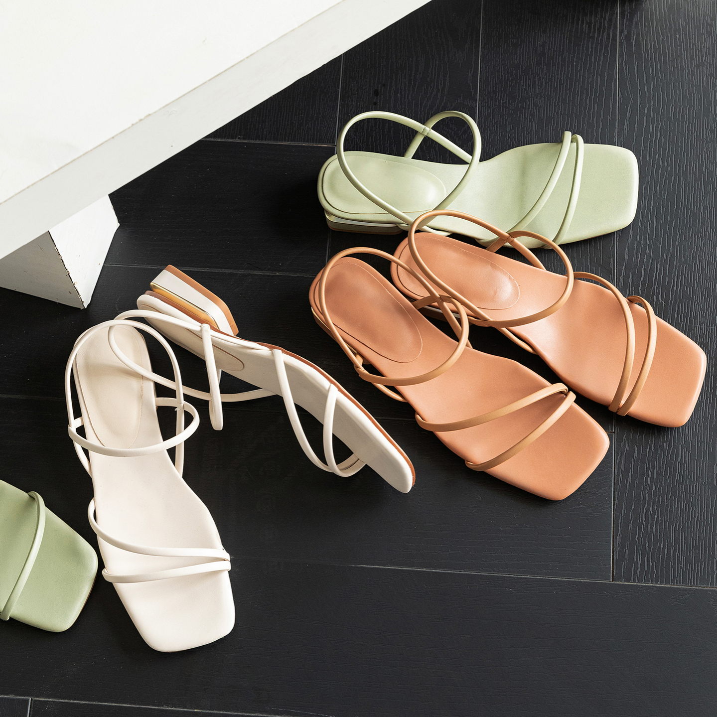 女夏季 方头露趾一字带罗马细带低跟凉鞋 法式 开怀依足洛林小姐~