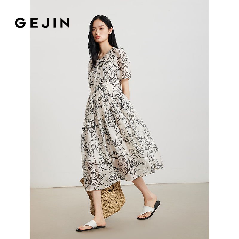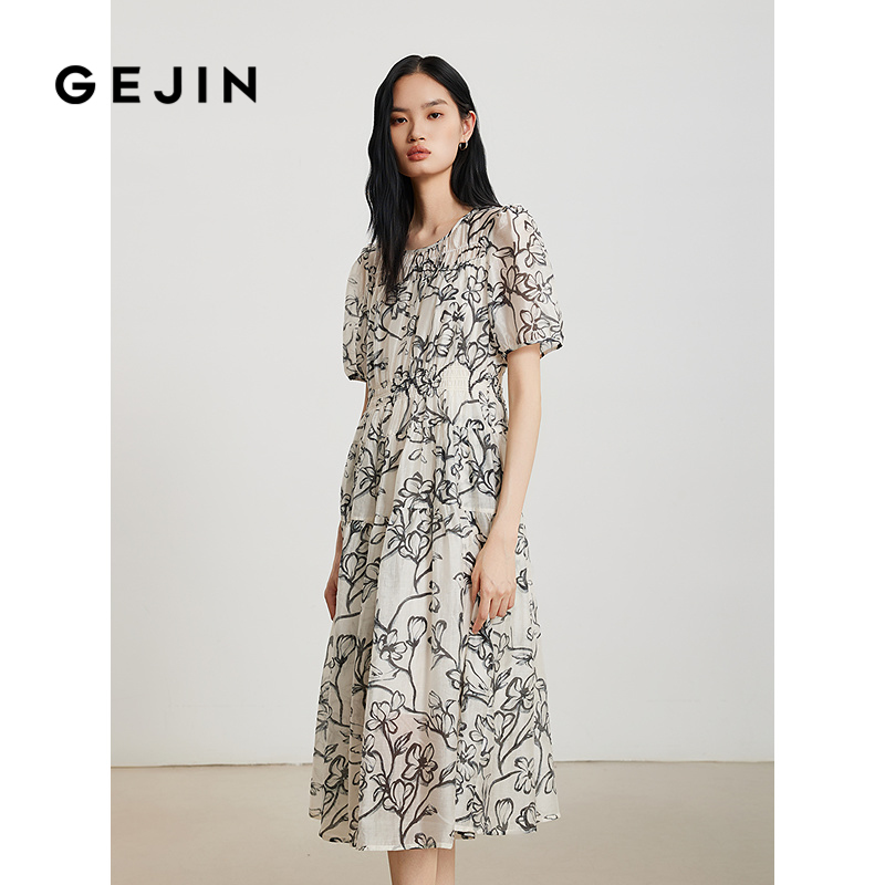 新款 2025夏季 印花连衣裙显瘦中长款 歌锦莱赛尔天丝度假南法泡泡袖
