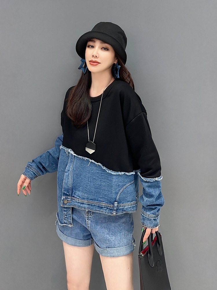 气质卫衣拼接牛仔不规则单件套头上衣百搭休闲女 韩版 2025 秋新款