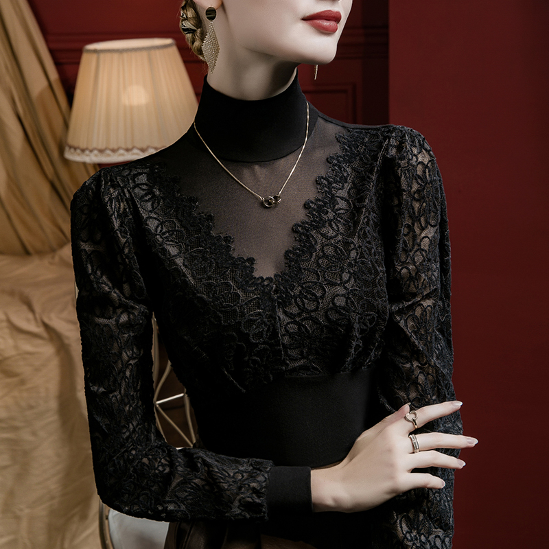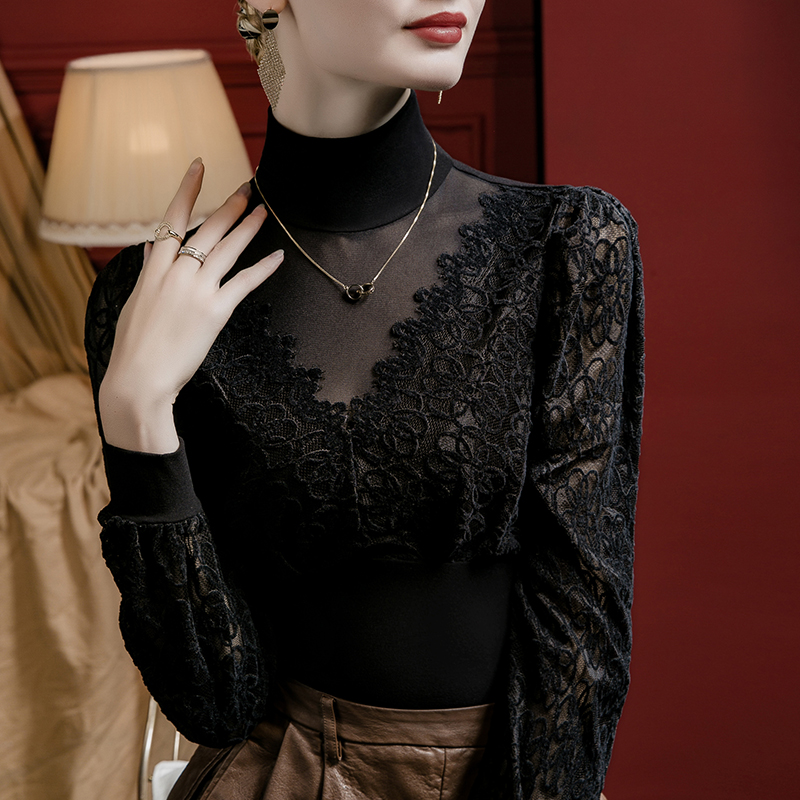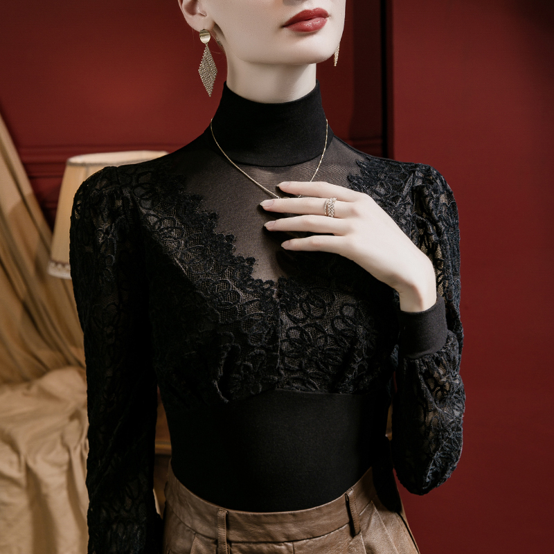 洋气女装 立领网纱拼接蕾丝小衫 灯笼袖 新款 上衣黑色显瘦 女2025秋季
