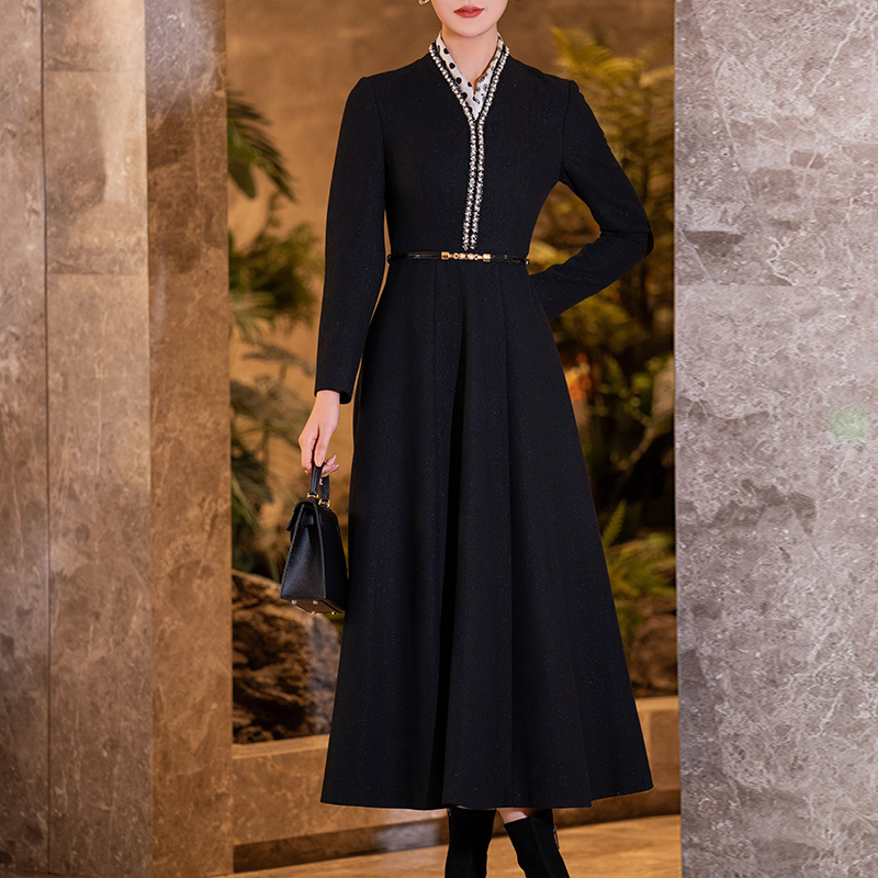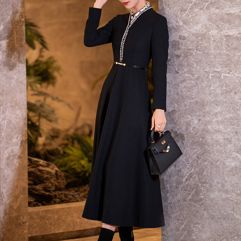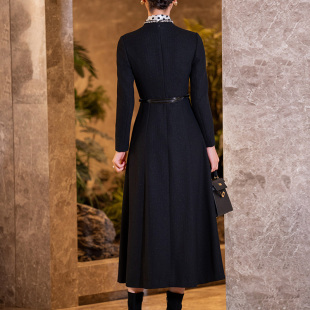 大摆长袖 黑色毛呢小香风连衣裙女冬新款 显瘦长款 气质修身 裙子 时尚