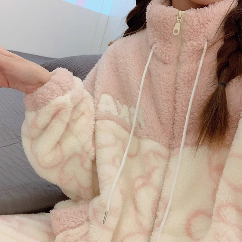 大码 春秋开衫 女士家居服 加厚珊瑚绒睡衣女冬法兰绒加绒套装 秋冬季
