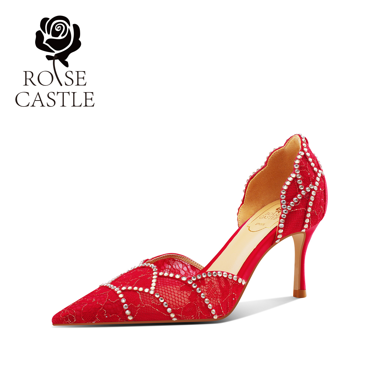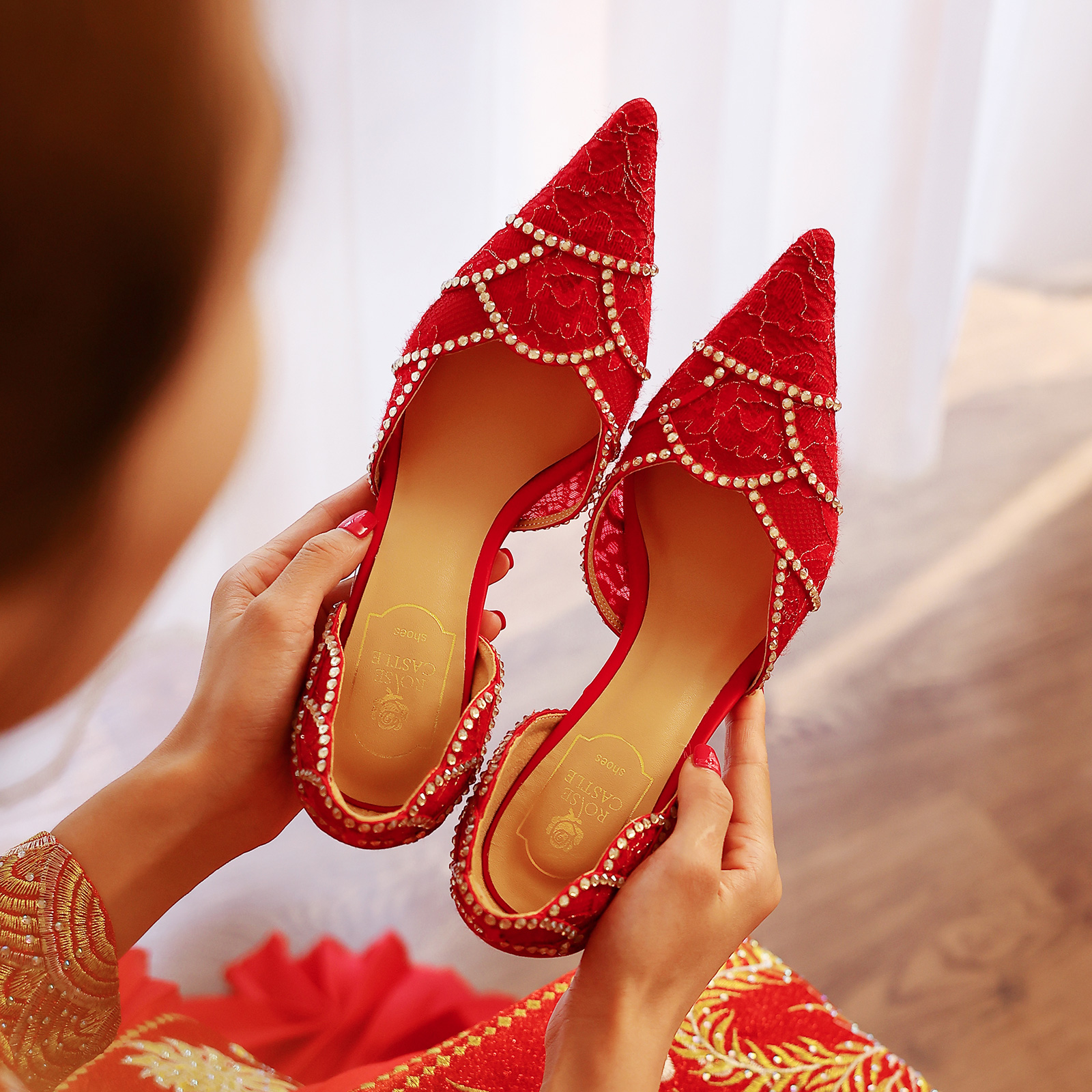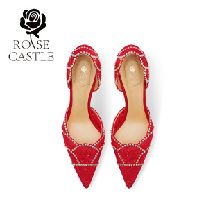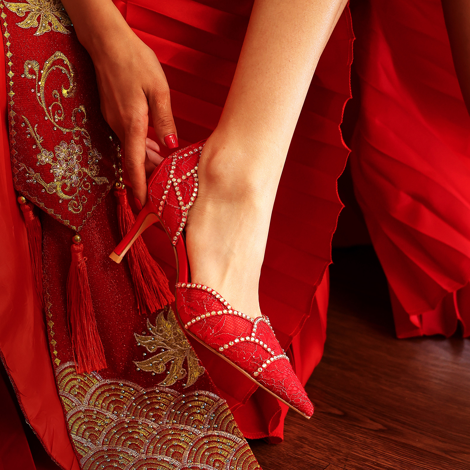 秀禾敬酒服轻奢红色一字带高跟鞋 蔷薇花影rosecastle婚鞋 女新娘鞋
