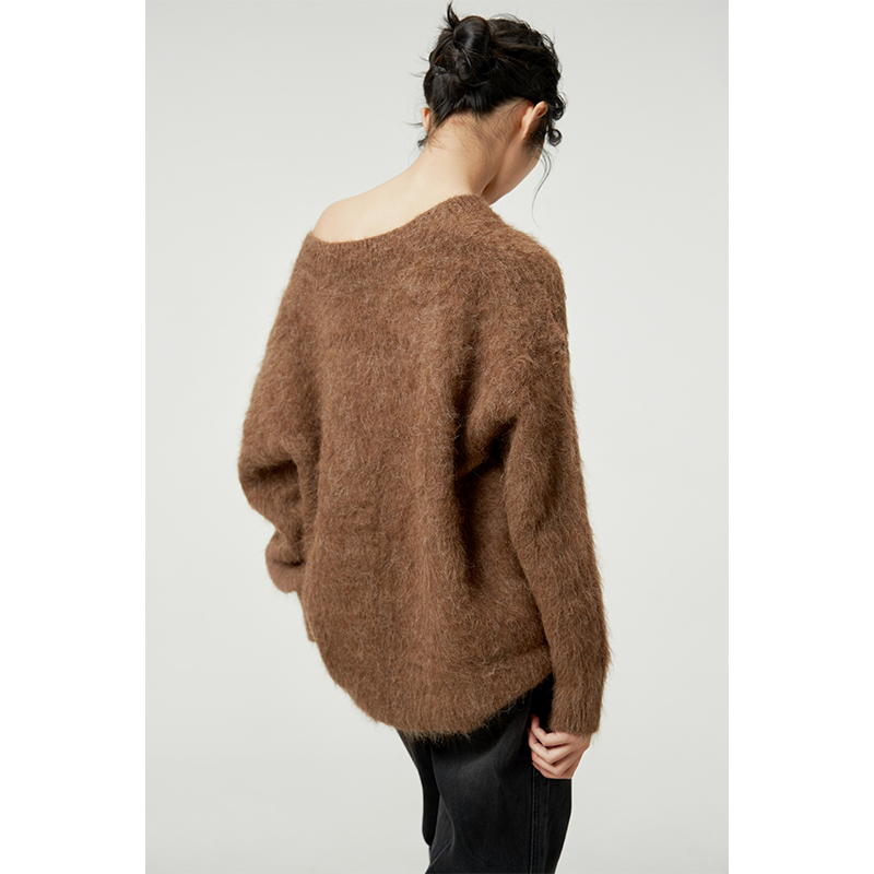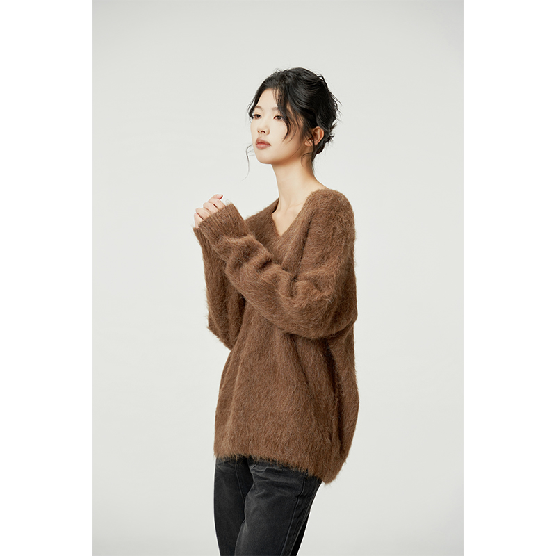 慵懒风羊驼毛v领中长款 宽松韩版 外套潮 新款 咖啡色毛衣女2024冬季