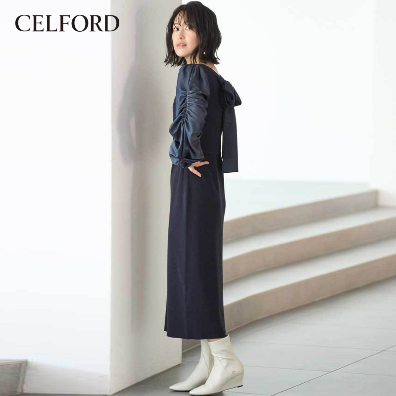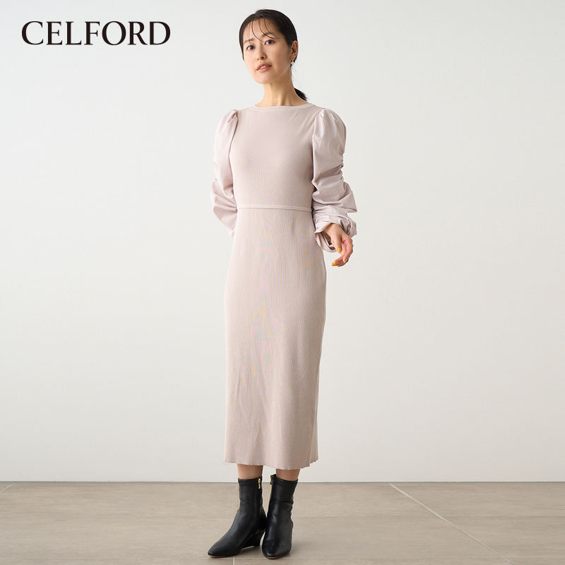 CELFORD秋冬 拼接针织连衣裙CWNO235036 优雅拼色泡泡袖