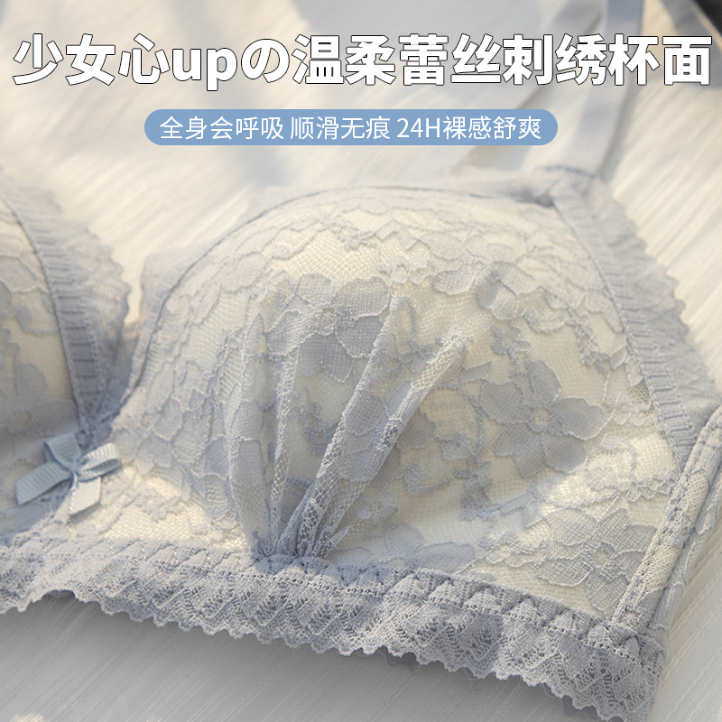 好奇蜜斯小胸聚拢内衣女薄显大无钢圈蕾丝文胸罩套装 防下垂夏 法式