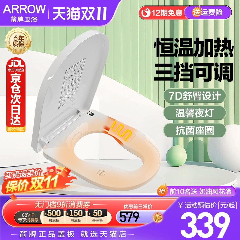 箭牌加热马桶盖VU形防水夜光单加热盖板家用通用缓降人体工学座圈