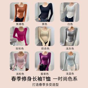 内搭可外穿正肩掐腰上衣收腰 打底衫 玫红色U领修身 t恤女2025年新款