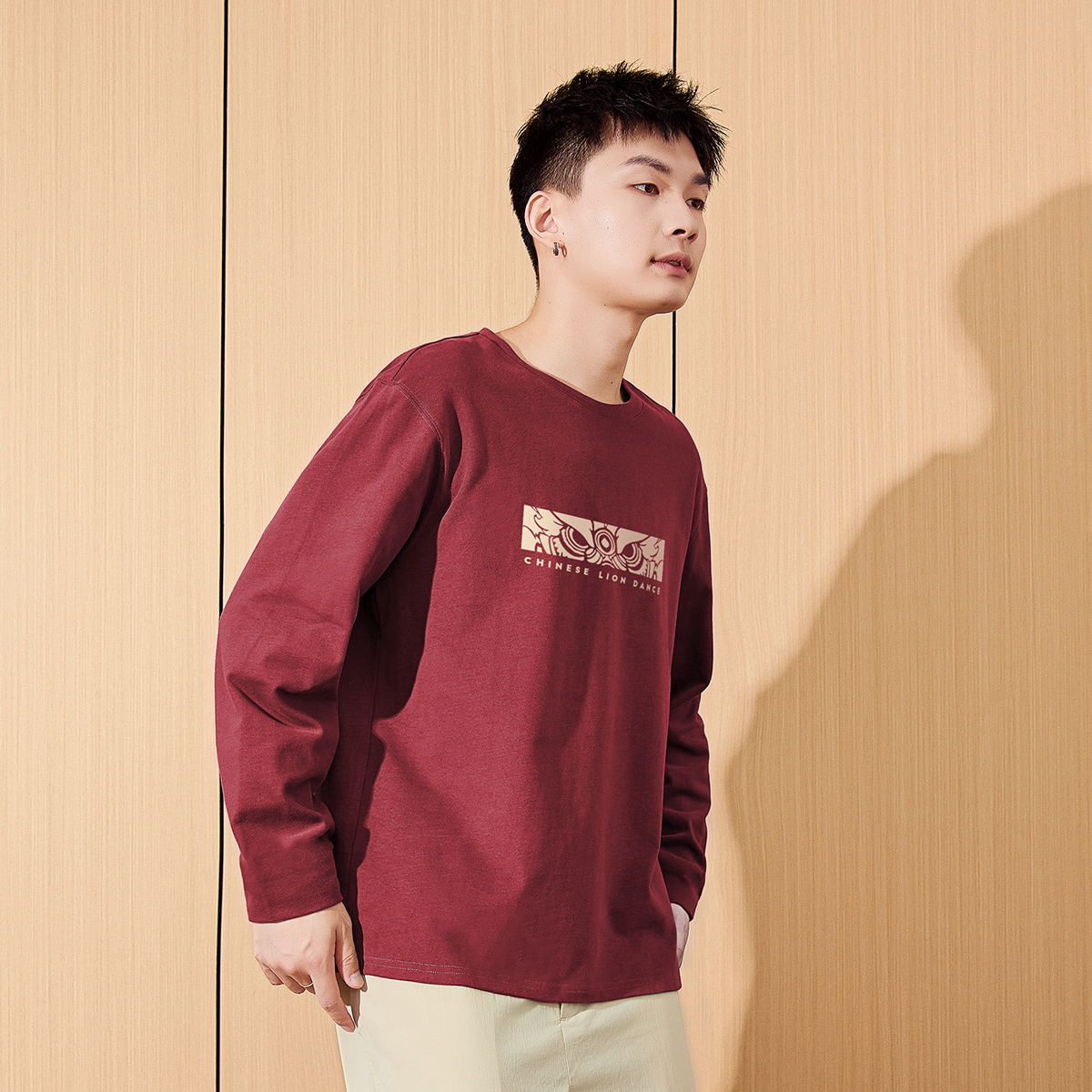 上衣 T恤男宽松纯棉圆领潮流内搭红色打底衫 唐狮2025春秋新款 长袖
