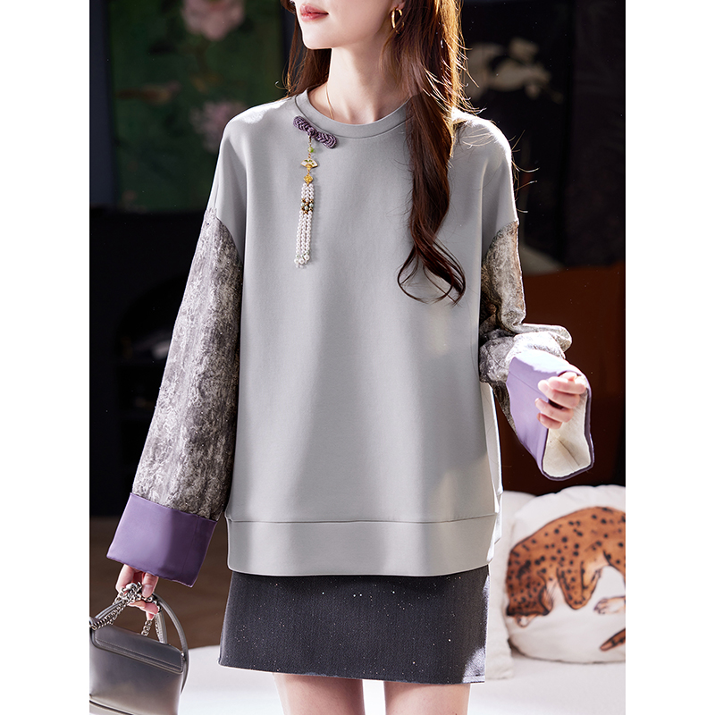 盘扣流苏休闲气质女装 宝诗黎圆领烫钻提花拼接卫衣2025秋季 新中式